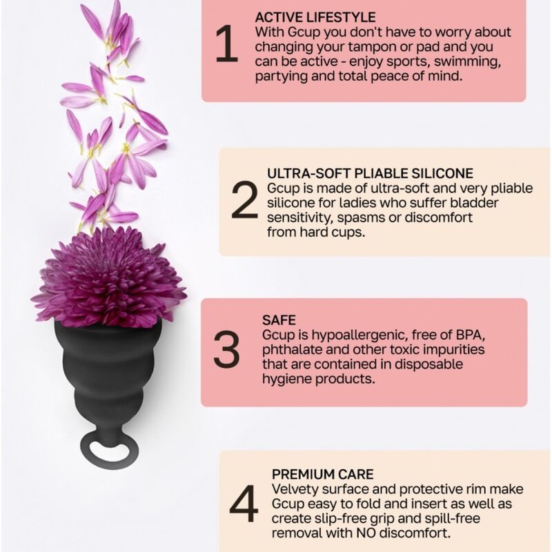 Gcup-kuukautiskuppi on kellonmuotoinen. Gcupin tärkein etu on sisäinen takaiskuventtiili. Venttiilin ansiosta neste ei palaa emättimeen aktiivisen elämäntavan aikana. Voit tehdä päivittäisiä aktiviteettejasi, urheilla ja jopa uida unohtamatta täysin "nämä päivät". Gcupissa on pehmeä ja sileä pinta, ja sen koko on täydellinen, joten et tunne oloasi mukavaksi. Lisäksi kupit säästävät merkittävästi rahaa perinteisiin siteisiin ja tamponeihin verrattuna. Gcup-kuukautiskuppi on ehdottoman turvallinen naisten terveydelle.