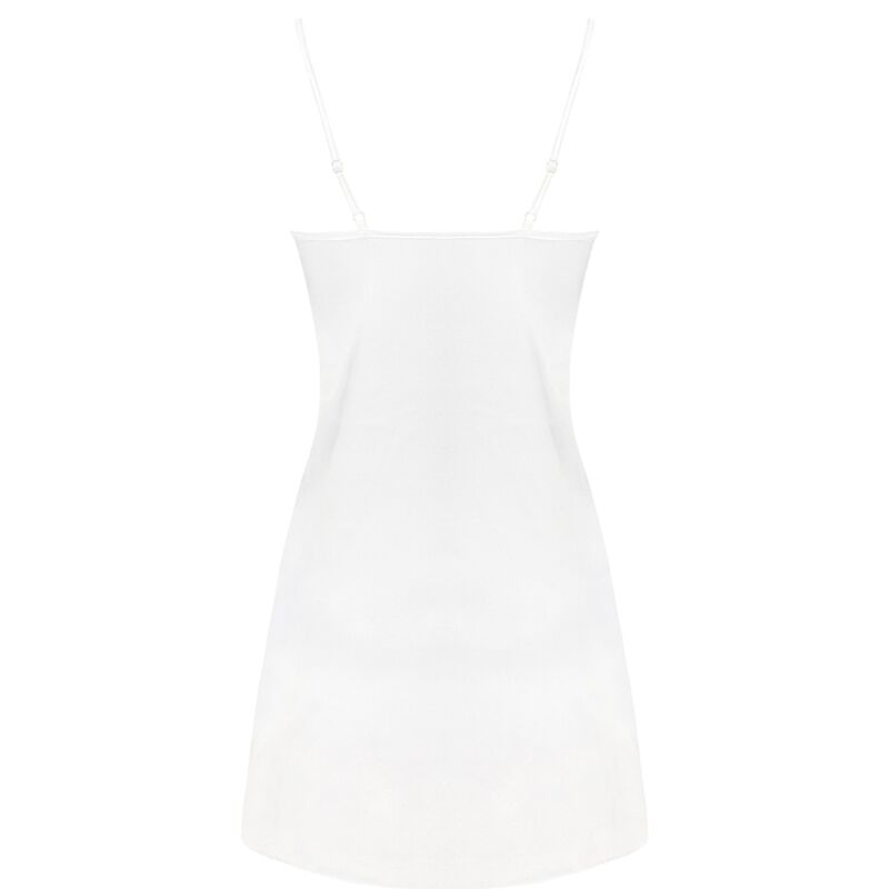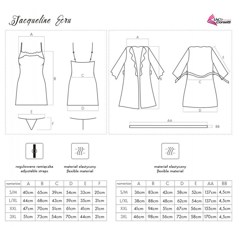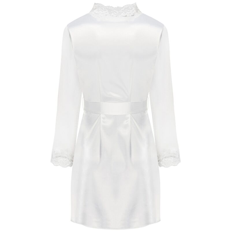 Poikkeuksellisen kaunis kiiltävästä luonnonvalkoisesta satiinista valmistettu alusvaatesarja, kylpytakki ja reisien puoliväliin ulottuva aluspaita. Kylpytakin etuosa ja pitkät hihat on sidottu vyötäröltä vyöllä ja koristeltu kauniilla pitsillä. T-paita, jossa on ohuet, säädettävät olkaimet, koristeltu samalla pitsillä rinnan kohdalla. Mukana stringit.