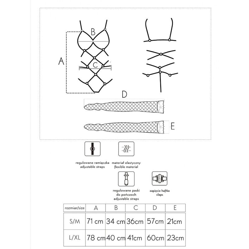 Setin yläosa koostuu seksikkäistä mustista raidoista, jotka on kietoutunut vatsan kohdalta ja yhdistetty renkailla. Yläosassa olkaimet ympäröivät tyylikkäästi rintaa peittämättä sitä, kun taas alaosassa ne muuntautuvat pehmeästi stringeiksi. Yksittäiset olkaimet kulkevat stringien molemmin puolin ja myötäilevät viehättävästi lantiota. Setin alaosassa on mustat, pituudeltaan säädettävät verkkosukkahousut. Sukkahousut kiinnitetään hakasilla asun yläosaan edestä ja takaa.
